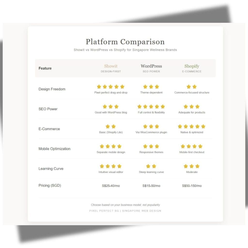 Small business website platform comparison showing Showit WordPress and Shopify interfaces